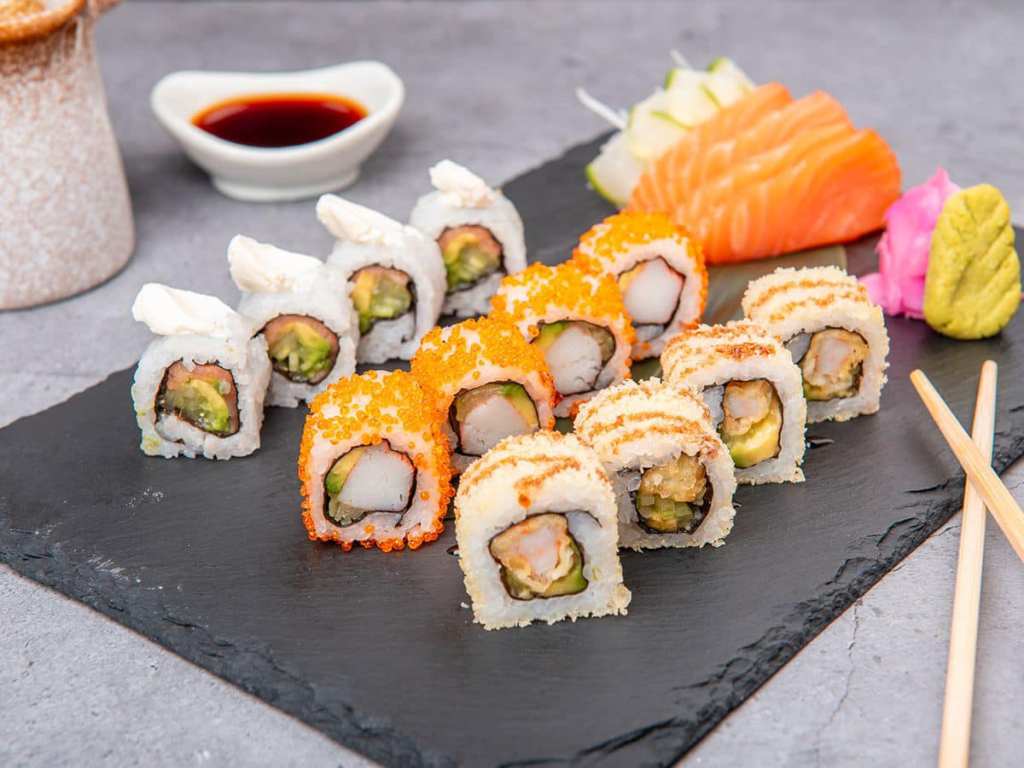 The menu features an array of sushi including crunchy prawn tempura maki, salmon avocado maki, California rolls, Philadelphia maki, as well as salmon nigiri. Vegetarian maki rolls are available upon request. View the complete menu here.