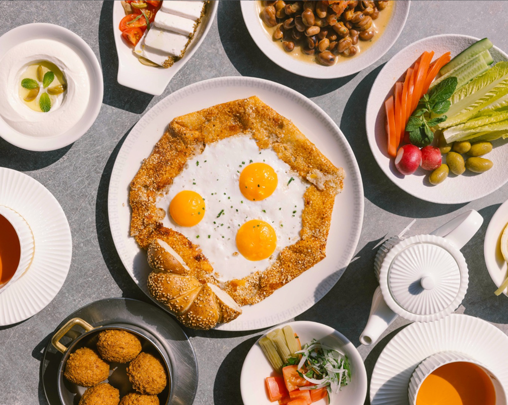 Known for its progressive twist on Lebanese cuisine, this Dubai Mall restaurant not only nails dinner dishes but also offers an equally lavish feast for breakfast. The breakfast set (priced at AED 90, with a minimum order for two) features eggs (your choice of sunny side up or scrambled), assorted mini manakish, foul, falafel, and eggplant with yoghurt, along with sides like pickles and veggies.